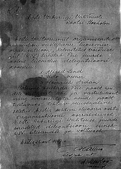 Eesti Vabariigi Valitsusele Stokholmis